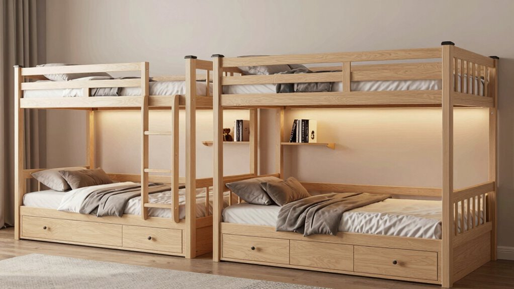Choosing a bunk bed with storage isn’t just about style or extra space; safety features play an essential role in protecting kids from accidents. Guardrails, especially full-length ones on the upper bunk, are critical to prevent children from rolling out while sleeping. Secure ladders and anti-toppling devices add stability, which is especially important in beds with built-in storage that might shift or wobble. Rounded edges and thoughtful design minimize bumps or cuts during use. Proper safety features also guarantee the bed meets safety standards, giving parents peace of mind. It’s important to prioritize these elements to create a safe environment. Well-designed safety features not only protect kids but also guarantee the bunk bed is reliable and sturdy, making it a worthwhile investment.