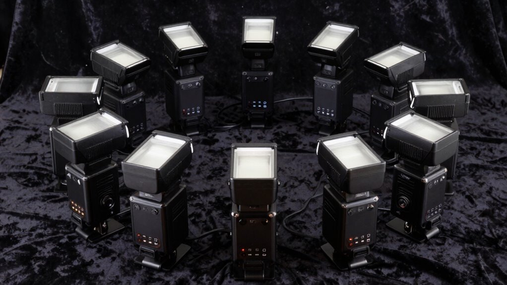 Wireless triggering options for camera flashes are essential tools that can expand your creative possibilities, but selecting the right system depends on several key factors. RF systems are great for long-distance control, often reaching several hundred meters with minimal interference, making them ideal for outdoor or large-scale setups. Optical slave modes, on the other hand, rely on the flash’s pre-flash or main flash to trigger secondary units, but they’re more vulnerable to obstacles and ambient light. Compatibility is also crucial—some flashes have built-in receivers, while others require external triggers that support multiple channels and groups. Modern triggers offer versatile control, letting you manage several flashes independently or in groups, which is vital for complex lighting arrangements.