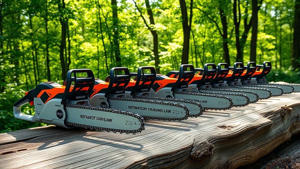 Safety features are crucial when evaluating chainsaws because they directly impact user protection and ease of operation. Chain brakes and dual safety switches prevent accidental injuries by stopping the chain quickly if something goes wrong. Inertia-activated chain brakes engage automatically during kickback, reducing severe injury risk. Tool-less chain tensioning systems make adjustments fast and safe, minimizing manual handling hazards. Safety bumpers and hand guards protect against debris and accidental contact with the chain, keeping your hands safe. Features like lowVib technology and ergonomic handles help reduce operator fatigue, which can lead to mishandling and accidents. Prioritizing these safety features ensures not only a safer cutting experience but also greater confidence during use, making them essential factors in choosing the best chainsaw for 2026.