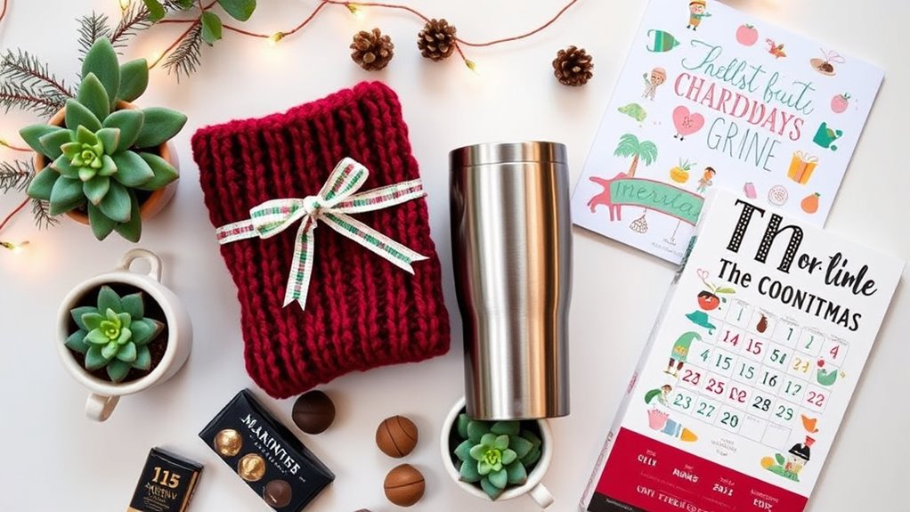 Choosing versatile Christmas gifts for coworkers under $25 can be a bit tricky, but I believe it’s all about finding options that appeal to a broad audience. Items like humorous office accessories or practical desk supplies work well for both men and women. I’ve found that multi-purpose gifts, such as decorative ornaments or stylish candles, fit nicely in various office environments. Additionally, practical gifts like travel mugs or gift cards cater to different tastes and interests, making them universally appreciated. By selecting gifts that can be enjoyed by anyone, regardless of their job roles or personal preferences, I guarantee my thoughtful gesture resonates with all my coworkers, creating a warm and inclusive holiday spirit in the workplace.