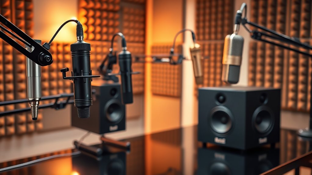 Accessories like shock mounts and pop filters are essential in making your recordings sound professional. Think of a shock mount as a stabilizing anchor, reducing vibrations, while a pop filter acts like a shield, blocking unwanted plosive sounds. They’re small investments that considerably improve sound clarity, giving your recordings a polished, studio-quality edge. Without them, even the best microphone can’t reach its full potential.