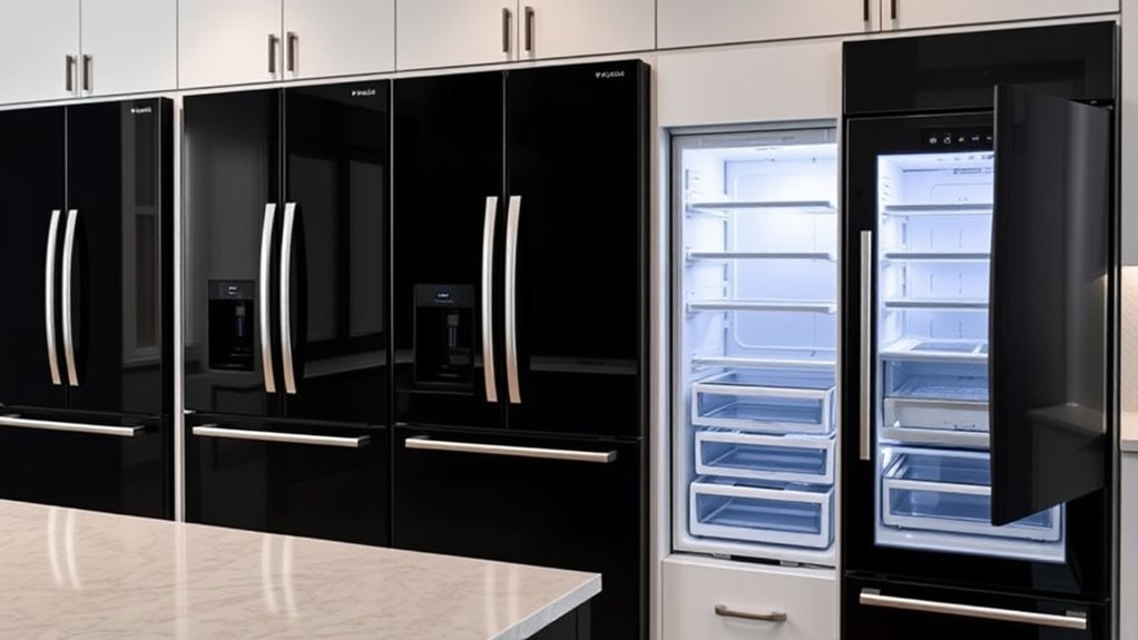 Choosing the right storage capacity for your counter-depth refrigerator depends on how much space you need for your weekly groceries and bulk items. Usually, family households require between 15 to 25 cubic feet to store everything comfortably. To determine what’s best, I assess the number of shelves, drawers, and door bins needed to organize different food types and container sizes efficiently. If you prefer specialized storage, like crisper drawers or deli drawers, make sure the fridge can accommodate those features. Since counter-depth models typically offer 15 to 20 cubic feet, it’s essential to pick one that matches your storage needs without compromising your kitchen layout. Balancing capacity with available space ensures your fridge is both functional and fits seamlessly into your kitchen.