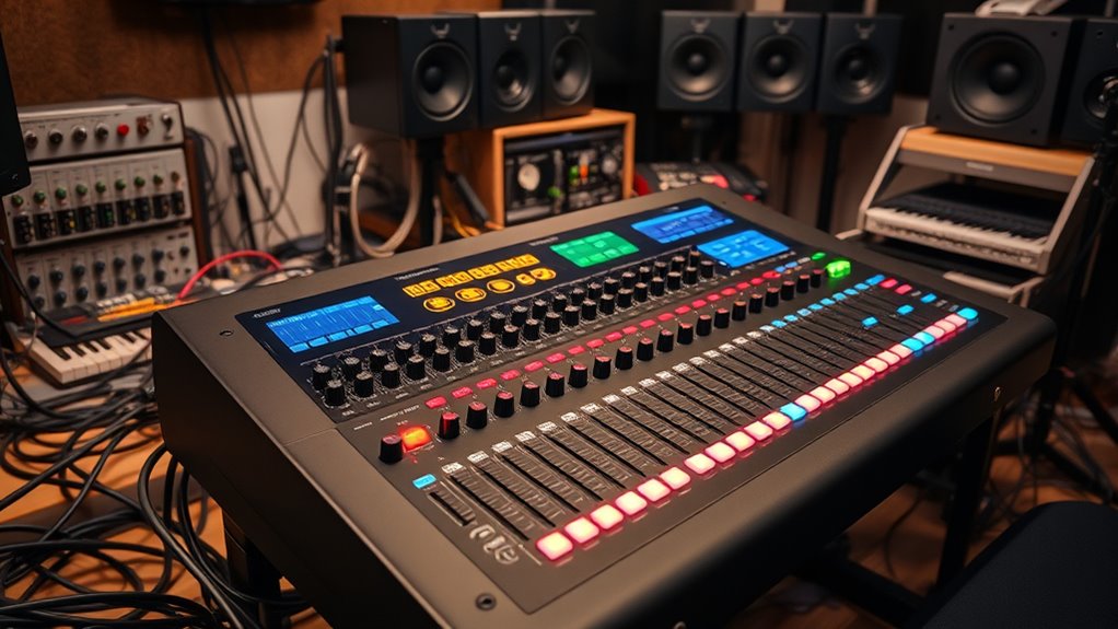 Digital mixers seamlessly integrate with existing audio systems by connecting via standard interfaces like USB, Ethernet, or Dante, allowing smooth communication with other equipment. I verify compatibility by checking the mixer’s inputs, outputs, and network protocols match my setup. With features like plug-and-play connectivity and customizable routing, I can quickly incorporate a digital mixer into my system, enhancing control and sound quality without needing a complete overhaul.