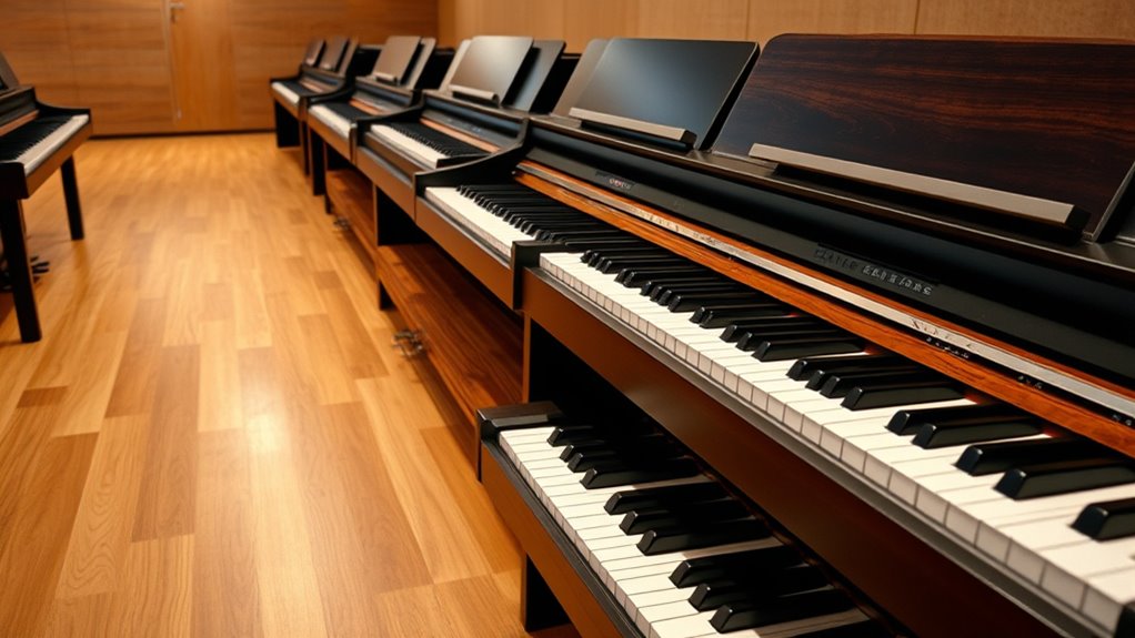Choosing the right pedals and control features can considerably enhance your digital piano experience, especially when weighted keys aim to replicate the feel of an acoustic instrument. Pedals like sustain, soft, and sostenuto give you expressive control, allowing for nuanced performances. A three-pedal setup can mimic the feel of an acoustic grand, boosting realism. Adjustable pedal sensitivity and response settings let you customize the feel to match your playing style, making practice more comfortable. Connectivity options such as MIDI and audio input/output expand your control capabilities, enabling integration with external devices for recording or additional sound options. High-quality pedals with durable construction and smooth action not only feel more authentic but also last longer, ensuring your setup remains reliable as you develop your skills.
