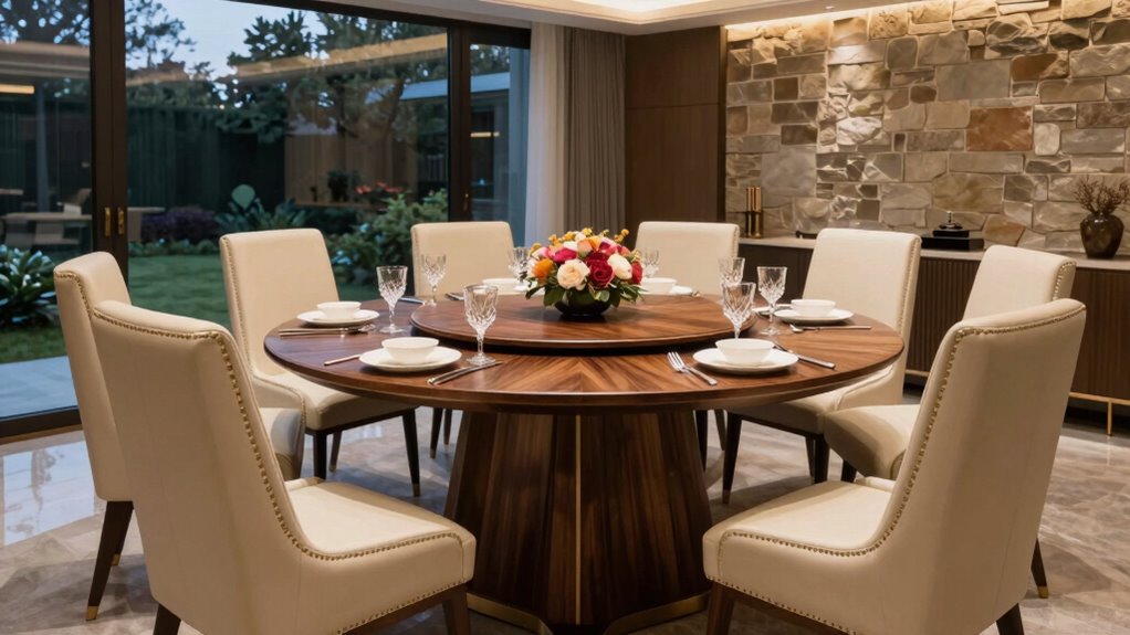 Imagine your home as a canvas—your dining table is its centerpiece. For contemporary spaces, I’d choose sleek, minimalist designs with clean lines, symbolizing clarity and innovation. In traditional homes, ornate, carved tables reflect history and warmth. Matching your style creates harmony, like a painting that resonates with its frame. I recommend selecting pieces that echo your home’s personality, ensuring your dining area feels both authentic and inviting.