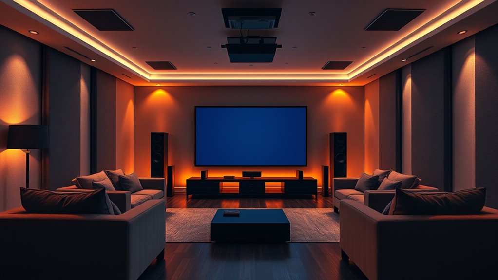 Room acoustics considerably impact Dolby Atmos performance because they influence sound clarity, directionality, and immersion. I’ve found that hard surfaces reflect sound, which can cause echo or muddiness, while soft materials absorb sound, reducing clarity. To optimize Atmos, I recommend adding rugs, curtains, or acoustic panels to manage reflections. Properly treating your room ensures you experience true three-dimensional sound, making your home theater much more immersive and enjoyable.
