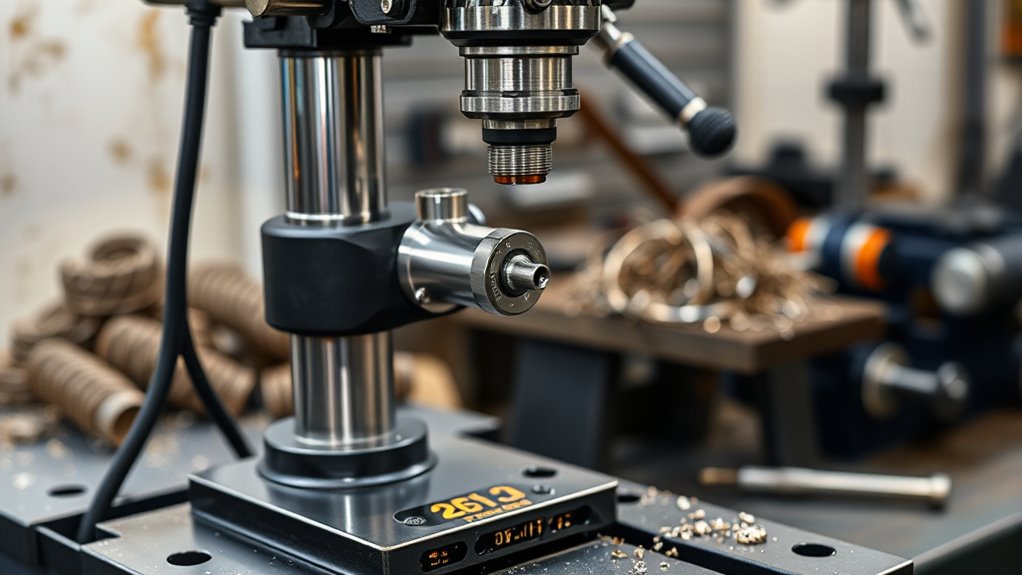 Achieving precise and accurate results in metalworking depends heavily on the drill press’s ability to control and maintain consistent performance. Features like precise spindle speed control and digital readouts make it easier to set and monitor speeds, ensuring accurate drilling depths. Laser guides and X-ray positioning systems help with exact alignment, reducing errors and misplacements. A stable, cast iron construction minimizes vibration and deflection, which is essential for maintaining accuracy during operation. Adjustable worktables with tilt and height features enable precise positioning for angled or varied-depth drilling. High-quality chucks with tight tolerances reduce bit runout, leading to cleaner, more accurate holes. All these factors work together to enhance precision, making your metalworking projects more consistent and professional.