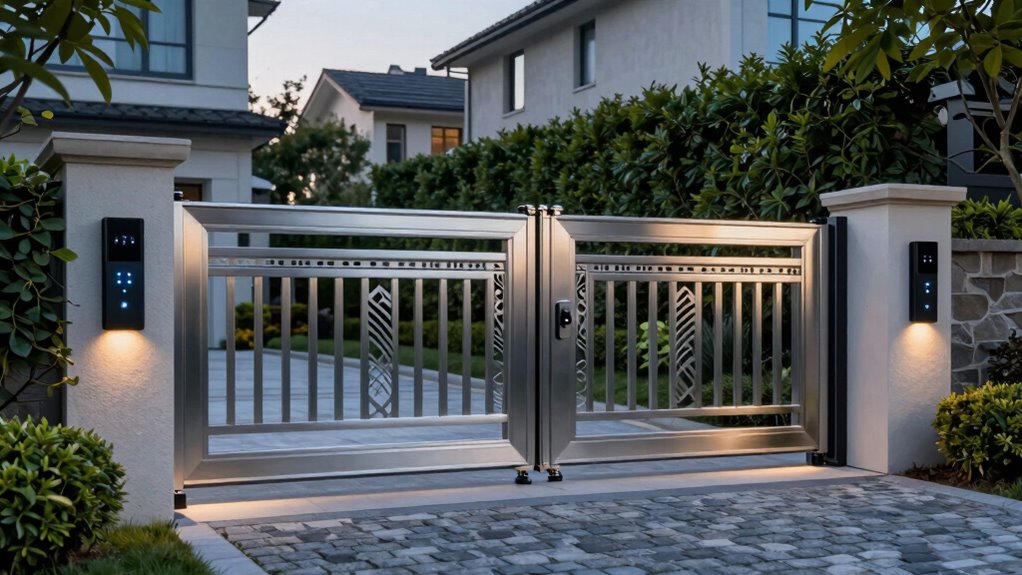 Safety and security features are vital considerations when picking out a driveway gate opener, as they directly impact the safety of your family and the protection of your property. Obstacle detection with stop-and-reverse functions prevents accidents and damage by stopping the gate if something is in its path. Encryption technologies like rolling code remotes make it harder for intruders to hack into your system. Automatic close functions help guarantee your gate isn’t left open unintentionally, boosting security. Electromagnetism limit switches enable precise gate positioning, reducing misalignment risks. Backup manual release keys are essential for safe operation during power outages or malfunctions. These features work together to provide peace of mind, safeguarding both your loved ones and your property from potential hazards.