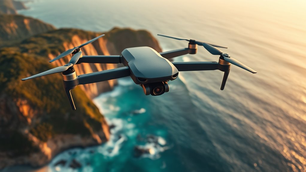 Choosing a drone with a camera isn’t just about image quality and flight time—portability and design play a key role in making your flying experience convenient and hassle-free. I look for lightweight, foldable models that are easy to carry, especially for outdoor adventures. Compact forms with carrying cases or storage boxes make transportation simple and protect the drone during travel. I also consider how quickly I can set up and pack down the drone, saving time before and after flights. Durability is essential, so I pay attention to materials that balance strength with lightness. Ultimately, I want a design that’s portable without sacrificing stability or performance, ensuring I can capture stunning shots wherever I go without feeling burdened by my gear.