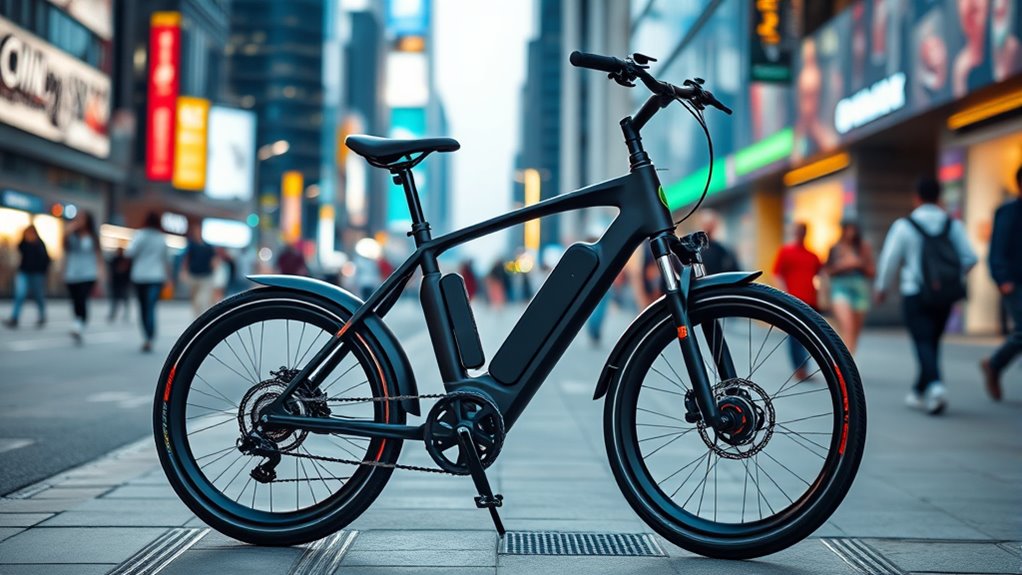 Ensuring safety features are in place can make a significant difference in my daily commute on an e-bike. Bright LED headlights, taillights, and reflectors boost visibility, especially during early mornings or late evenings, reducing accident risks. Dual disc brakes—hydraulic or mechanical—offer reliable, quick stopping power in diverse weather and terrain conditions. Built-in safety alerts like turn signals and horns improve communication with drivers and pedestrians, making my ride safer. Waterproof ratings such as IPX4 or IPX6 guarantee lights and electrical components work properly in rain, preventing malfunctions. Advanced security features, including NFC smart unlocking and lockable batteries, help protect my e-bike from theft or unauthorized use. These safety features collectively give me peace of mind and confidence during my daily commute.