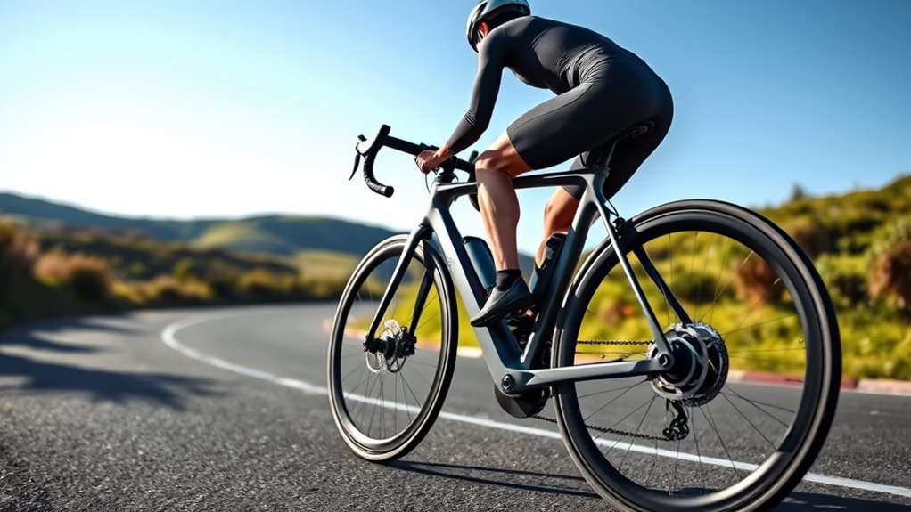 The motor power of an electric road bike directly influences its top speed and acceleration. Generally, higher wattage motors deliver faster starts and better climbing ability, making your ride smoother and more responsive. Motors range from 250W to 1500W, with more powerful options enabling higher speeds and quicker acceleration. Your chosen motor wattage also affects the maximum speed, which varies depending on the riding mode you select. For instance, a 750W motor can comfortably handle fast urban commuting or off-road trails, especially when paired with a larger battery for sustained high speeds. Different power levels cater to specific needs—lighter motors for city rides and stronger ones for performance-focused riders. Ultimately, motor power is key to balancing speed, acceleration, and riding style.