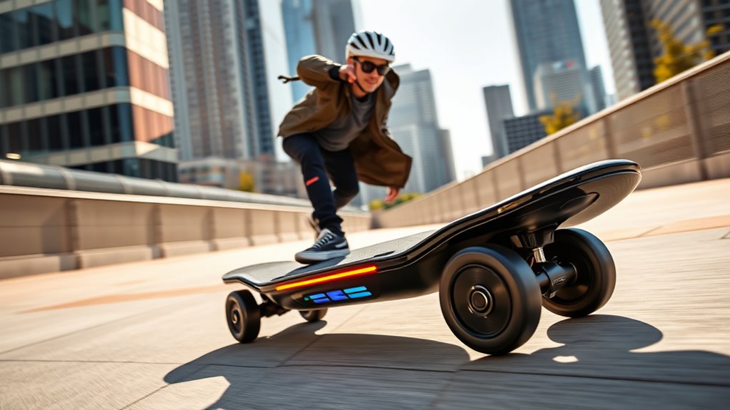 These skateboards are packed with safety features that make riding safer than ever. I love how the dual-brake systems give me instant control, and the LED lights guarantee I stay visible at night. Most come with robust wrist guards and anti-slip decks, making falls less likely. Plus, the battery management systems prevent overheating. Honestly, they make me feel confident enough to ride at top speeds without a second thought!