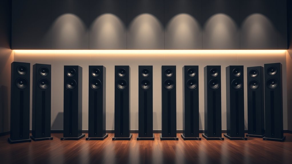 Choosing the right floor-standing speakers depends heavily on your room size, as it determines how well the speakers can fill the space with sound. In larger rooms, you’ll want speakers with higher wattage and more powerful drivers to guarantee even coverage and avoid dead spots. Bigger rooms also benefit from speakers with wider dispersion patterns, helping sound reach every corner clearly. Bass response is another consideration; larger spaces often require larger woofers or additional subwoofers for deep, balanced sound. Conversely, small rooms need more compact speakers with lower power handling to prevent overwhelming the space and to maintain clarity. Matching your speaker size and power rating to your room’s dimensions ensures an immersive listening experience tailored to your space’s acoustics.