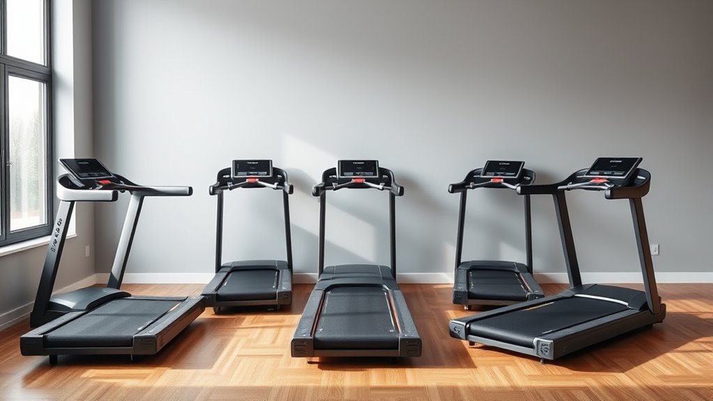 Did you know that over 80% of treadmill accidents involve slips or falls? Foldable treadmills include safety features like emergency stop buttons, safety keys that shut off when detached, and low-profile designs to prevent tripping. I always look for models with sturdy handrails and non-slip surfaces to guarantee my safety during workouts. These features give me peace of mind, especially when space is limited.