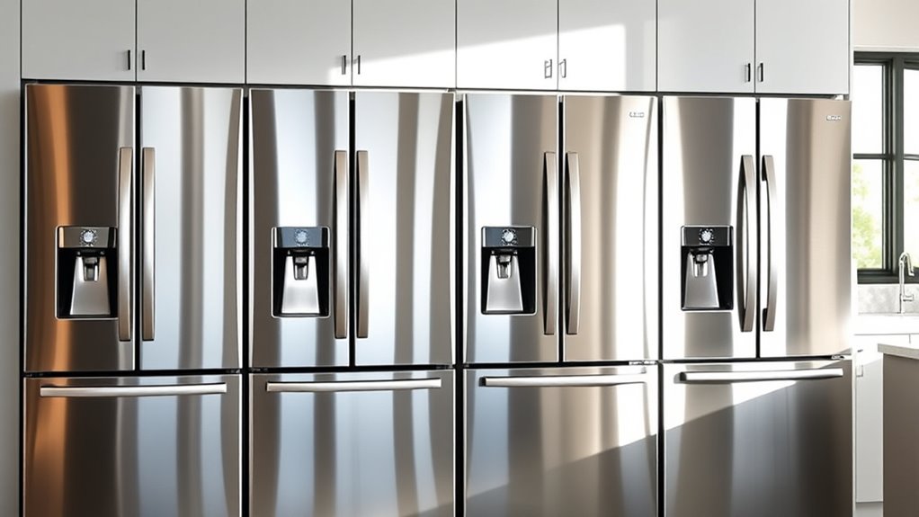 Modern French door refrigerators come equipped with advanced cooling features that guarantee your food stays fresh longer and your energy bills stay low. Technologies like the Multi-Flow Air System and Dual Evaporators ensure even temperature distribution throughout the fridge, preventing hot spots. Inverter Compressors maintain a consistent temperature efficiently, reducing both energy use and noise. Rapid cooling functions, such as Accela Chill, quickly lower the temperature of groceries after loading, preserving freshness. Door Cooling+ technology uses dedicated vents to evenly cool the interior, keeping temperatures stable. Additionally, ENERGY STAR certified models incorporate efficient cooling systems that conserve energy without sacrificing food quality. These features work together to keep your food fresh, your energy costs down, and your fridge running smoothly.
