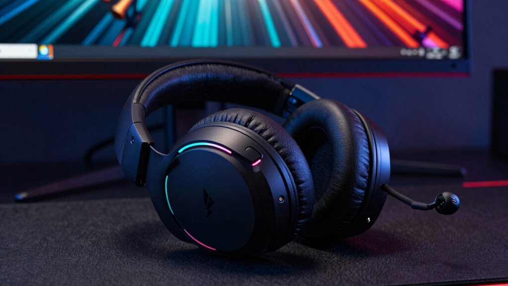 Comfort and fit are essential factors that can make or break your gaming experience, especially during those extended PS5 sessions. I recommend looking for headsets with adjustable headbands and cushioned ear cups, which help achieve a secure yet comfortable fit. Lightweight designs, ideally under 300 grams, reduce fatigue and make long gaming marathons more enjoyable. Breathable, memory foam ear cushions are necessary to prevent overheating and discomfort during intense play. If you wear glasses, choose headsets with glasses-friendly technology and flexible ear cups to avoid pressure points. A snug, secure fit that stays in place during movement is fundamental, but it shouldn’t be so tight that it causes pain. Prioritizing these factors ensures a comfortable, immersive experience every time you hit the console.
