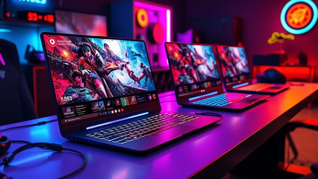 If you’re looking for the best gaming laptops of 2026 that will truly elevate your play, I’ve got you covered. From powerful processors like AMD Ryzen 7 and Intel Core i7 HX to next-gen GPUs like RTX 5070 and RTX 5060, these machines deliver blistering speeds, stunning visuals, and smooth gameplay. Features like high refresh rate displays, ample RAM, and fast storage make them perfect for gamers who demand the best. Keep going to discover which models stand out.
