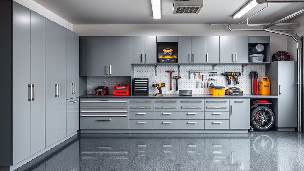 Imagine opening a sturdy garage cabinet that automatically latches shut—modern safety features like soft-close hinges prevent pinched fingers. I’ve seen cabinets with integrated locks to keep curious kids out and vents that reduce fumes buildup. These thoughtful designs make me feel secure knowing my tools and chemicals are stored safely. With built-in alarms or anti-tip straps, I trust today’s cabinets to protect my family and keep my garage organized and safe.