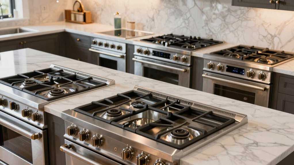 Did you know that a burner’s flame size can vary by up to 50%? Different burner configurations really impact cooking performance—larger burners heat faster and are great for boiling, while smaller ones offer precise simmering. I’ve found that a mix of both allows for versatile cooking, giving me control over heat levels. Choosing the right setup helps me cook efficiently and achieve perfect results every time.