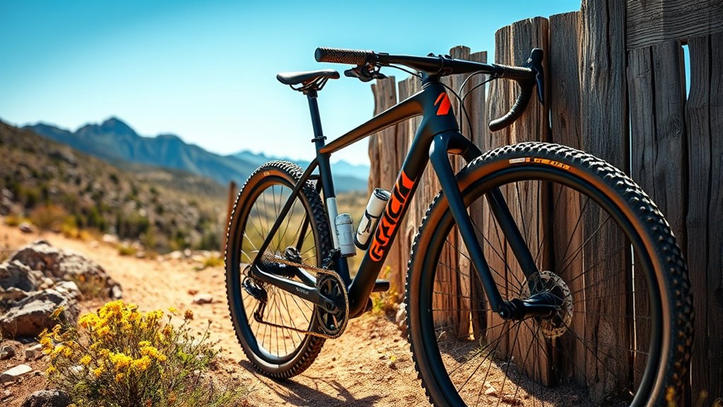 Comfort and ergonomics are essential factors that can make or break your gravel riding experience, especially over long distances and rough terrain. I look for bikes with adjustable handlebars and saddles, so I can customize my position for maximum comfort. Ergonomic grips are a game changer—they reduce hand fatigue and support my hands during extended rides. A well-designed geometry that balances upright posture with agility helps minimize back and neck strain. Shock absorption features like suspension forks or cushioned seats make a huge difference by smoothing out vibrations from rocky surfaces. Proper weight distribution and frame design also contribute to stability and comfort, especially on uneven trails. Prioritizing these ergonomic elements guarantees I stay comfortable and focused, no matter how tough the terrain gets.