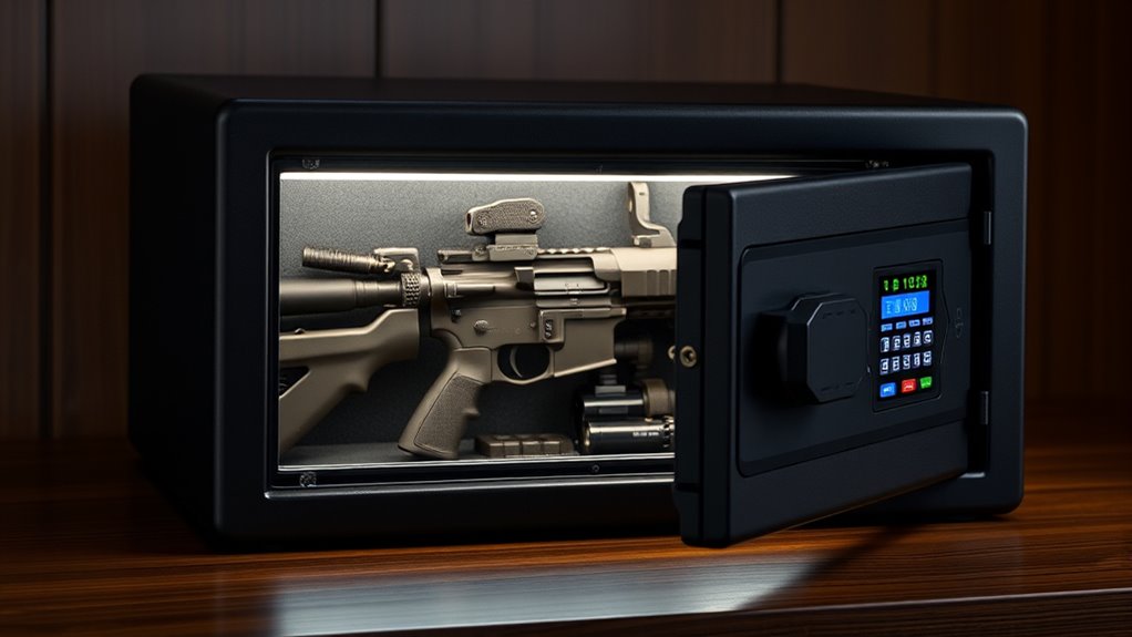 Choosing the right security level for a gun safe depends on the type of lock it features and its construction quality. I consider whether I want biometric, digital keypad, traditional key, or combination locks, as each offers different access control. For higher security, I look for safes with tamper-proof construction, reinforced doors, and multiple locking bolts to resist prying and forced entry. If I store valuable firearms or valuables, I prefer safes with advanced features like alarm systems, impact sensors, or anti-tamper technology to enhance security and alert me to unauthorized access. Additionally, I verify that the safe’s security rating meets local regulations for firearm safety and theft prevention. Matching the security level to my needs ensures proper protection and peace of mind.