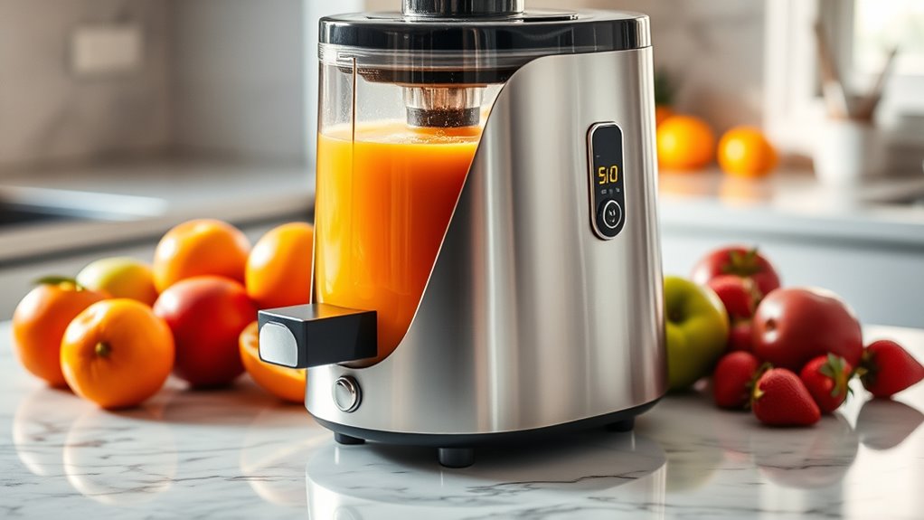 Choosing a high-end juicer often hinges on its technology and how efficiently it extracts juice; these machines typically use cold press or masticating methods that operate at low speeds. This approach helps preserve nutrients, flavor, and freshness while maximizing yield. High-end juicers can extract up to 99% of the juice from produce, greatly reducing waste and pulp. Multi-stage systems, like spiral augers and dual-layer strainers, enhance efficiency by thoroughly breaking down produce and extracting every drop. Running at slower RPMs minimizes heat and oxidation, which helps retain natural flavors and nutrients. The goal is to produce smooth, pulp-free juice with high clarity, ensuring you get the maximum nutritional benefit from your ingredients. This advanced technology makes high-end juicers a worthwhile investment for ideal juice quality.