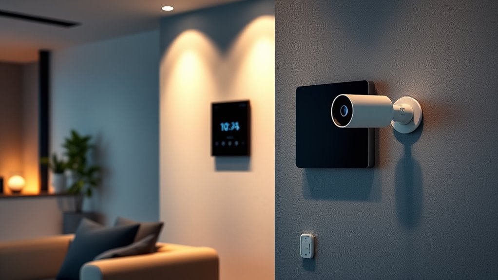 When selecting a home security system, considering your monitoring options is essential because they directly impact how quickly help arrives and how much control you have over your safety. Professional monitoring offers 24/7 service, dispatching emergency responders immediately when an alarm goes off, ensuring rapid assistance. Self-monitoring relies on you to respond to alerts via mobile apps, notifications, or alarms, giving you more control but potentially delaying help. Some systems provide hybrid options, letting you choose between professional oversight or self-monitoring based on your comfort level and budget. Your choice affects response times, ongoing costs, and your involvement in emergency situations. Carefully weigh these factors to select an option that aligns with your safety priorities and lifestyle.