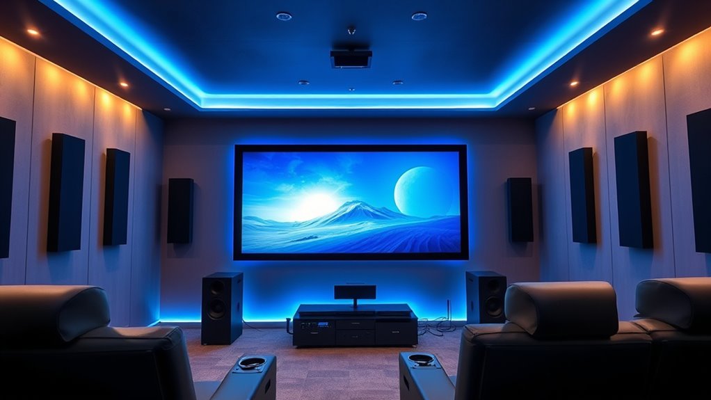 Room acoustics play a crucial role in ensuring your home theater delivers clear, immersive sound, especially in large spaces. Proper acoustic treatments like diffusers, absorbers, and bass traps help optimize sound distribution, reducing echo and standing waves that cause distortion. I recommend carefully considering speaker placement and listening positions based on room dimensions and reflective surfaces to achieve balanced sound coverage. Large rooms often require higher power and multiple speakers with precise calibration to maintain consistent volume and sound quality throughout the space. Additionally, soundproofing measures can block external noise, further enhancing your audio experience. By addressing these factors, you’ll create an environment where sound clarity and immersion are maximized, making every movie or game feel truly cinematic.