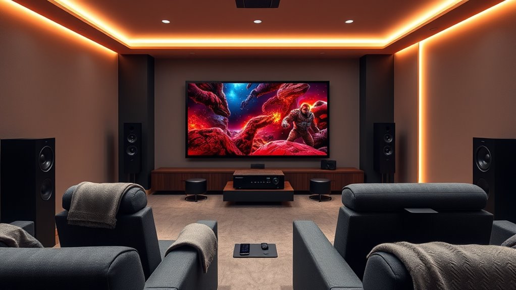 If you’re looking to elevate your movie nights, I recommend checking out top systems like the Sonos Arc with Dolby Atmos, the ULTIMEA Skywave X40, and Klipsch Reference 5.2. These deliver immersive sound, sleek designs, and easy setups. Whether you want a premium, wireless, or budget-friendly option, there’s something for every space and preference. Keep exploring these options to find the perfect match for your home theater needs.