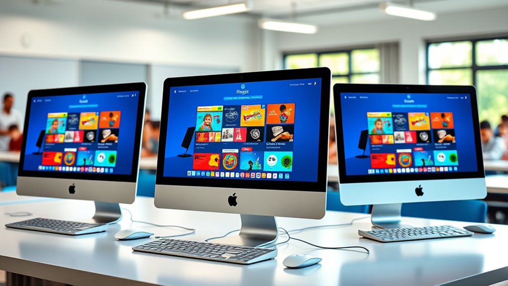 I’ve found that iMacs are incredibly compatible with a wide range of educational software. They support popular apps for coding, design, and learning games, making them versatile tools for teachers and students alike. Plus, their seamless integration with the Apple ecosystem guarantees smooth syncing and sharing. So, whether you’re running educational programs or creating content, iMacs deliver dependable, dynamic, and diverse digital destinations for classroom success.