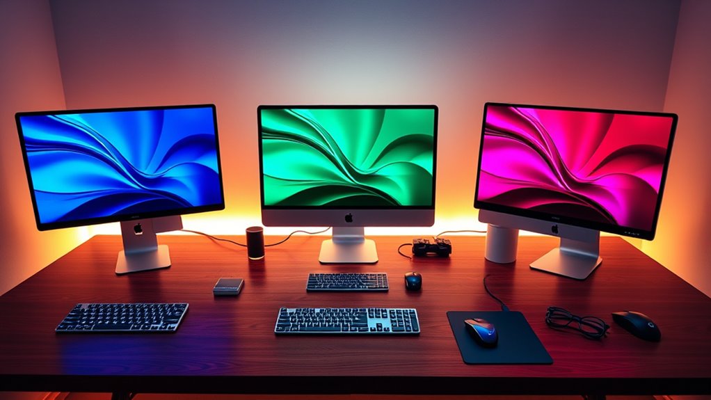 If you want a smooth multi-monitor setup, I recommend a reliable docking station like the CalDigit TS4. For example, I used it myself to connect three monitors seamlessly, boosting my productivity. It offers multiple USB ports, Ethernet, and excellent power delivery, simplifying cable management. This accessory guarantees your workspace stays organized and your workflow remains efficient, especially when working from home with multiple screens.