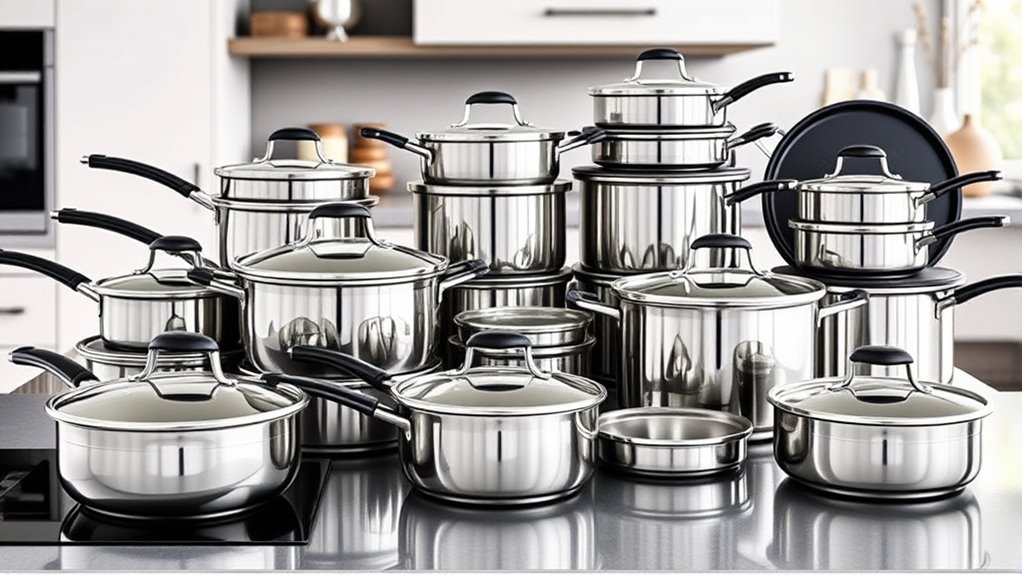 Price differences often reflect durability and performance in cookware. Higher-end sets tend to use better materials like anodized aluminum or stainless steel, which resist warping and scratching, ensuring longevity. They also often feature advanced non-stick coatings or thicker bases for even heat distribution. Cheaper options might save you money upfront but can wear out faster, leading to replacement costs. Investing a bit more usually means better performance and longer-lasting cookware.