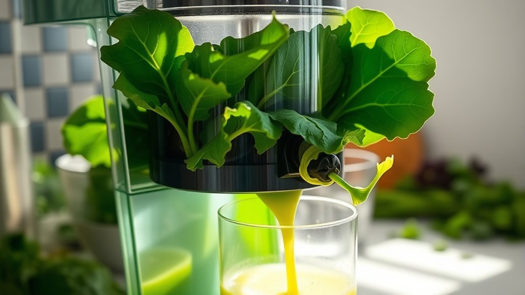 Choosing the right juicing speed and power is vital for getting the best results from leafy greens. Slower speeds, around 50-60 RPM, help reduce heat and oxidation, which preserves nutrients and flavor. Cold press or masticating juicers operate at these low speeds, gently extracting juice without damaging delicate greens. High torque motors are essential because they efficiently crush fibrous greens, preventing clogging and maximizing yield. While more powerful juicers can process tough greens quickly, they often generate more heat, risking nutrient loss. The key is balancing sufficient motor power with slow juicing speeds to guarantee thorough extraction without compromising nutrient quality. This combination allows you to get the most nutritious, fresh juice from your leafy greens every time.
