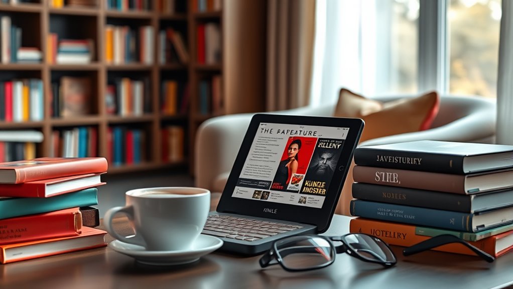 When I think about my reading preferences, device compatibility and usability quickly come to mind. I always make certain my Kindle device or app supports Kindle Unlimited, which works on all Kindle e-readers, Fire tablets, and compatible smartphone apps. Keeping my device’s software updated is vital for smooth access to features and avoiding any hiccups. I also check that my device’s storage can handle multiple downloads without slowing down. The screen size and resolution matter, too; a comfortable setup greatly enhances my reading experience. In the end, I value an intuitive user interface. Easy navigation and search functions make exploring my Kindle Unlimited library a breeze, guaranteeing I get the most out of my reading adventures.