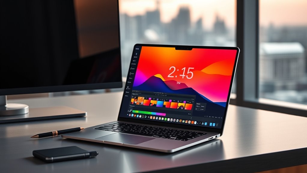 When choosing a laptop for video editing, I focus on the key factors that guarantee smooth performance and quality results. A powerful processor and ample RAM are essential for handling large files and complex edits, while fast storage keeps workflows efficient. I also prioritize a high-resolution display and a reliable graphics card to ensure accurate editing and vivid visuals.