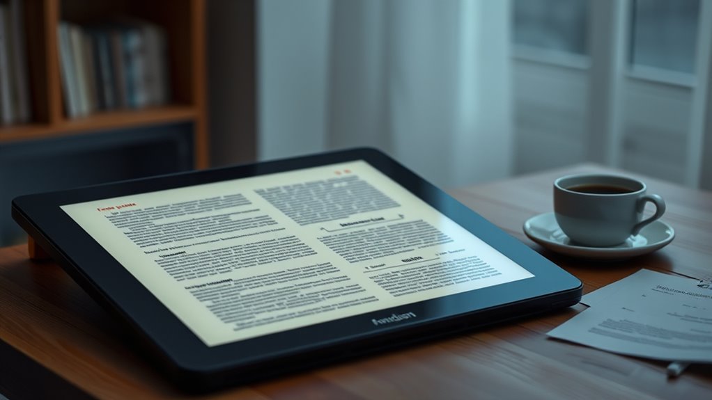 When choosing a large-screen e-reader for PDFs, it’s vital to take into account factors like screen size and resolution to guarantee clear, comfortable reading. You should also verify PDF compatibility and supported formats so your documents display correctly, along with features that enhance reading comfort, like adjustable lighting. Finally, don’t forget about battery life, storage options, and expandability to keep your reading experience seamless and flexible.