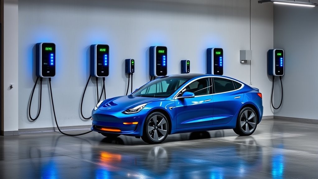 Ever wondered how fast your EV can charge at home? Level 2 chargers typically deliver between 9.6 and 12 kW, allowing most EVs to gain 20 to 50 miles of range per hour of charging. However, the actual speed depends on your vehicle’s onboard charger capacity; if it’s lower than the charger’s output, your car will charge more slowly. To maximize charging speed, your home’s electrical system should support at least 32 amps or more, ensuring you get the full benefit of the charger’s power. Keep in mind, the miles of range added per hour can vary—from around 20 miles with lower-power units to over 50 miles with higher-powered chargers. Faster charging reduces overall charging time, making daily top-ups quicker and more convenient.