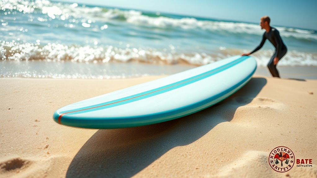 Prioritizing safety and stability features can considerably enhance your surfing experience, especially for beginners or those tackling more challenging waves. Longboards with a wide, stable design—typically 8 feet or longer—boost balance and reduce the risk of falls. Multiple fins or a tri-fin setup improve directional control, making turns smoother and more predictable. Soft top boards with foam construction and rounded edges lower injury risks, ideal for learners. Features like textured tail pads and ankle leashes help secure your footing and prevent slipping. Reinforced materials, such as triple stringer systems and durable foam cores, add to the board’s overall stability and longevity. These safety features not only protect you but also give you confidence to focus on improving your skills.