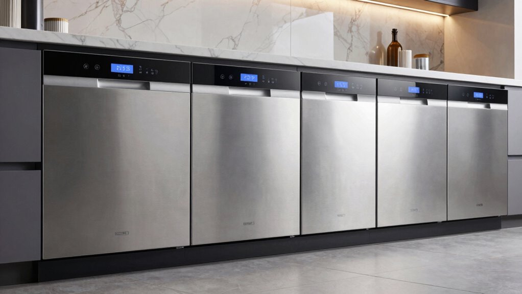 Advanced cleaning technology in luxury dishwashers not only guarantees spotless results but also plays a significant role in their energy efficiency. Many models meet or exceed ENERGY STAR standards, ensuring they use less energy per cycle and lower utility bills. They achieve high efficiency through sensors that optimize water use and cycle duration based on load soil levels, preventing waste. Certified energy-efficient dishwashers typically use between 2.77 to 3.5 gallons of water per cycle, conserving water resources. Features like eco modes and delayed start options enable operation during off-peak hours, maximizing savings. Compliance with these standards not only benefits the environment but also makes these appliances eligible for tax credits and rebates, making them a smart and sustainable investment for your home.