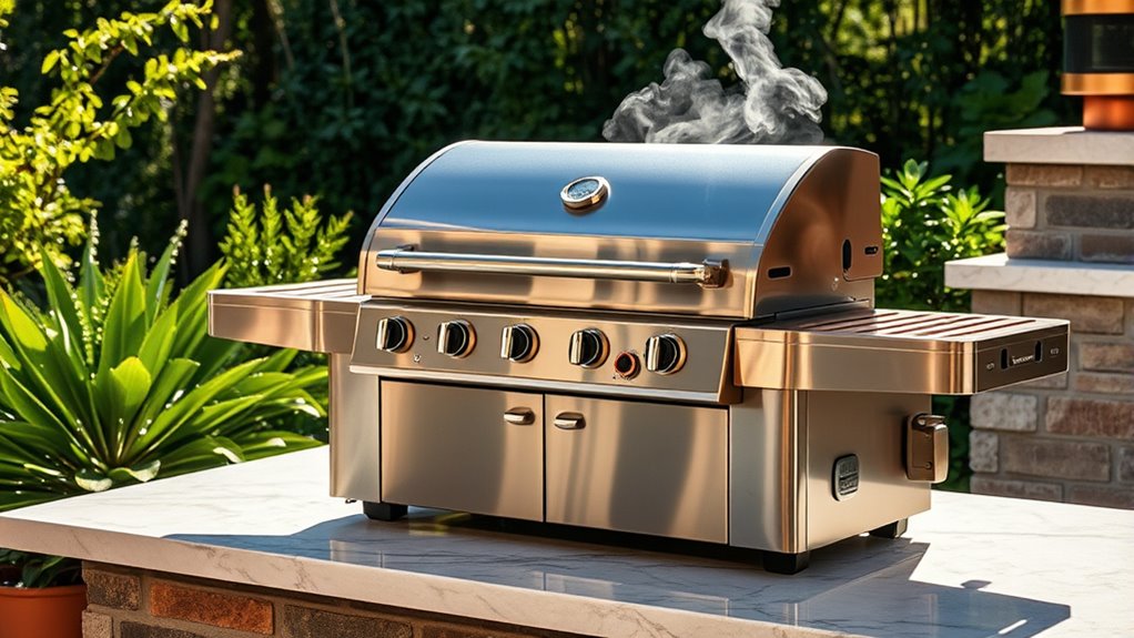 High-end luxury grills stand out with features like precise temperature control, durable premium materials, and advanced technology such as Wi-Fi connectivity for remote monitoring. They often include multiple burners, versatile cooking options, and elegant designs that enhance outdoor aesthetics. I love how these details make grilling more efficient, enjoyable, and impressive, elevating my outdoor cooking experience beyond standard models and turning every barbecue into a luxurious event.