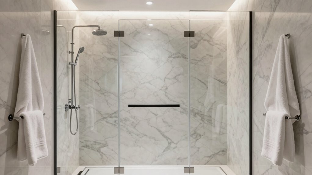 Choosing the right finish for your luxury shower system can dramatically enhance your bathroom’s style and ambiance. With options like matte black, brushed gold, chrome, and stainless steel, you can easily match your shower to your existing decor. The finish not only affects the look but also impacts durability—materials like brass and stainless steel resist tarnishing and fingerprints, ensuring longevity. Matte black and brushed gold offer a modern, sophisticated vibe, while chrome provides a timeless, shiny appeal. High-quality finishes often have anti-corrosion or anti-fingerprint coatings, helping your shower stay pristine over time. Whether you prefer a sleek contemporary feel or a more opulent look, the finish plays an essential role in creating a cohesive, stylish bathroom environment.