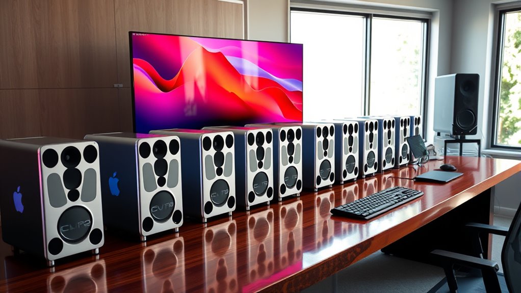 Choosing a Mac Pro that seamlessly integrates with your existing Apple ecosystem can considerably boost your post-production workflow. I look for models that support smooth sharing with my iPhone, iPad, and other Macs, making file transfers quick and effortless. Compatibility with professional editing software like Final Cut Pro, Adobe Premiere, and DaVinci Resolve, optimized for Apple Silicon, is essential. I also check for ports like Thunderbolt 4/5, HDMI, and SDXC slots to connect external displays, storage, and peripherals needed for editing. Features like AirDrop, Handoff, and Universal Clipboard streamline my workflow by enabling fast file sharing and device continuity. Additionally, support for external displays up to 8K resolution and multi-device synchronization enhances my multi-monitor setup, making editing more efficient and seamless.