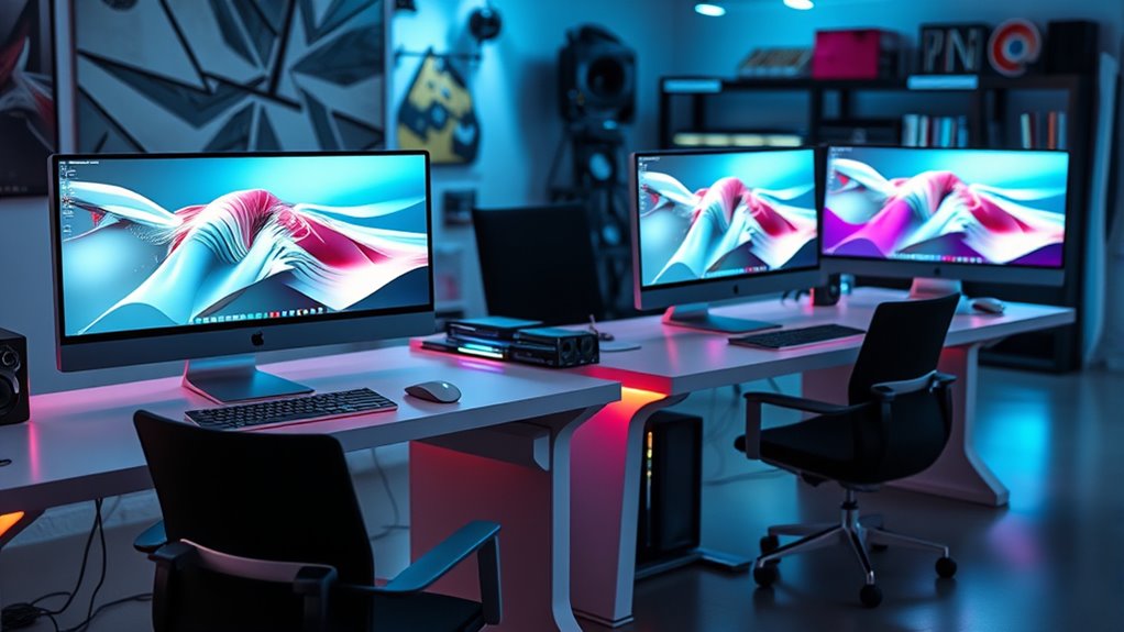 Choosing the right Mac Studio for 3D rendering means guaranteeing it has the necessary ports and connectivity options to support your workflow. I look for Thunderbolt 3 or 4, USB-C, HDMI, and Ethernet ports to connect multiple peripherals and high-resolution displays. Compatibility with my preferred 3D software is vital, so I verify that it supports Apple silicon architectures for maximum performance. High-speed external storage via Thunderbolt or USB-C is essential for handling large project files efficiently. I also check that the Mac Studio supports Wi-Fi 6E and Bluetooth 5.3 for seamless wireless connections to peripherals and networks. Finally, I make certain it can connect to multiple monitors simultaneously, enabling my multi-display setup for modeling and rendering tasks. These connectivity features keep my workflow smooth and efficient.