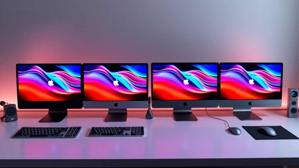 When selecting a Mac Studio with 128GB+ of unified memory, it’s important to verify that your essential applications are compatible with the device’s hardware and operating system. Make sure the software you rely on is supported by the latest macOS version and runs smoothly on Apple Silicon. Apps optimized for Apple Silicon, especially those with Universal Binary support, will perform more efficiently and leverage the hardware fully. Check if professional tools like Adobe Creative Cloud or Microsoft 365 support high-memory configurations for ideal performance. Additionally, confirm that any specialized or legacy applications you use are compatible with the current architecture and OS updates. Ensuring software support and compatibility will help you maximize your Mac Studio’s capabilities without disruptions.