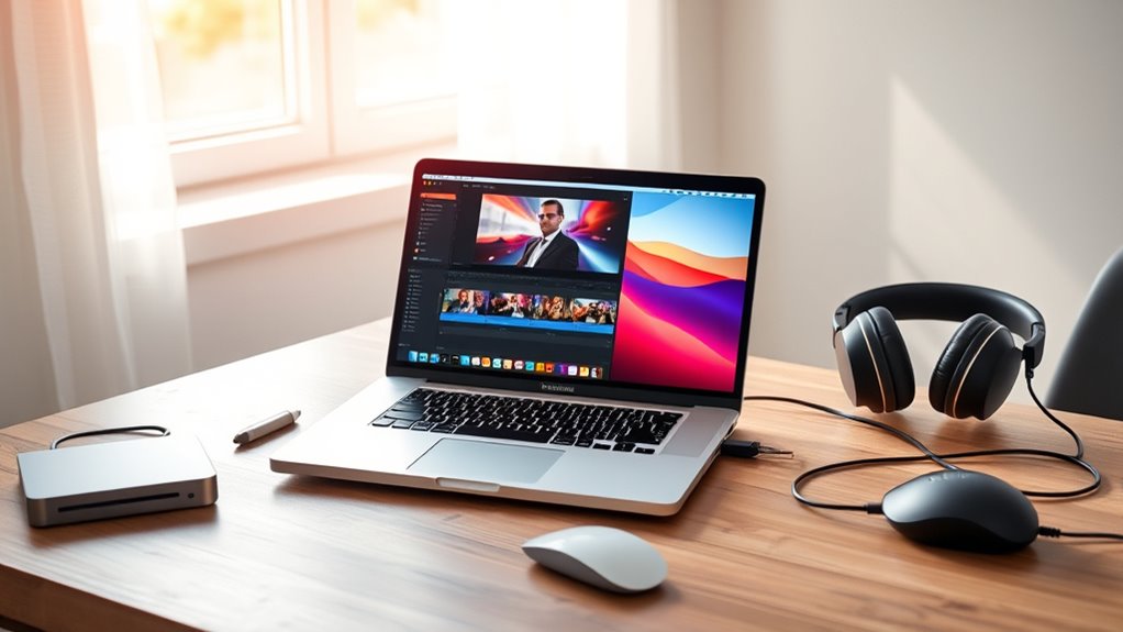 Ever wondered how the right ports and connections can streamline your video editing workflow on a MacBook Pro? It’s all about having quick access to essential peripherals. Multiple Thunderbolt 4 or 5 ports allow for blazing-fast data transfers and support multiple external displays, boosting multitasking. An HDMI port makes connecting to larger monitors or projectors simple, which is vital for reviewing footage. The SDXC card slot offers direct, hassle-free transfer of footage from cameras, eliminating the need for adapters. A headphone jack supports high-impedance headphones, guaranteeing accurate audio monitoring during editing. Finally, USB-C ports provide versatile, fast connections for external drives, hubs, and other peripherals. Together, these ports guarantee a seamless, efficient editing experience, keeping your workflow smooth and uninterrupted.