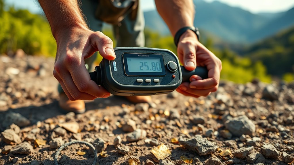Ground balance features are essential for optimizing a metal detector’s performance, especially in challenging soil conditions. They help the detector compensate for mineralization in the soil, reducing false signals and improving detection accuracy. Automatic ground balance adjusts itself continuously during use, making it perfect for beginners or unpredictable terrains. Manual ground balance, on the other hand, lets you fine-tune settings for specific soil types, boosting precision in targeted areas. Proper ground balancing is especially important in mineral-rich soils, sandy beaches, or rocky terrains, where mineralization can interfere with signals. By setting the ground balance correctly, you extend the search coil’s effective depth and improve your ability to distinguish between trash and valuable targets, making your searches more efficient and successful.