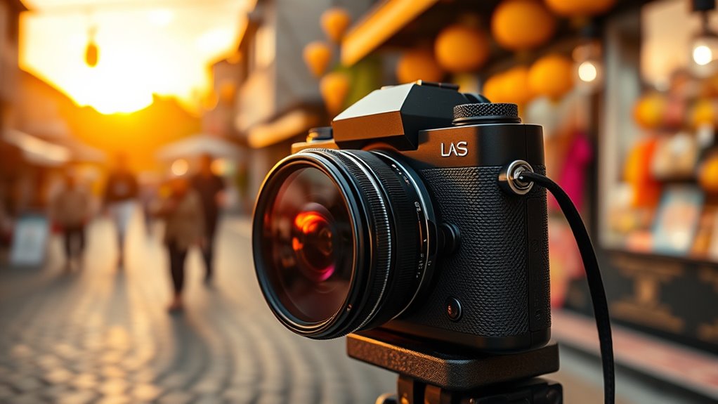 When choosing a mirrorless camera for travel, lens versatility is essential because it determines how well your gear adapts to different shooting situations. A versatile camera supports a range of interchangeable lenses, like wide-angle, standard zoom, and telephoto options, allowing me to capture landscapes, detailed close-ups, and distant subjects without switching cameras. Compatibility with third-party lenses broadens creative options and prepares me for any travel environment. Cameras with zoom lenses, such as 16-50mm or 18-135mm, offer all-in-one solutions for diverse needs while keeping weight down. Supporting both prime and zoom lenses maximizes creative control, enabling seamless changeover between different styles of travel photography. This flexibility ensures I’m ready for any shot, wherever my adventures take me.