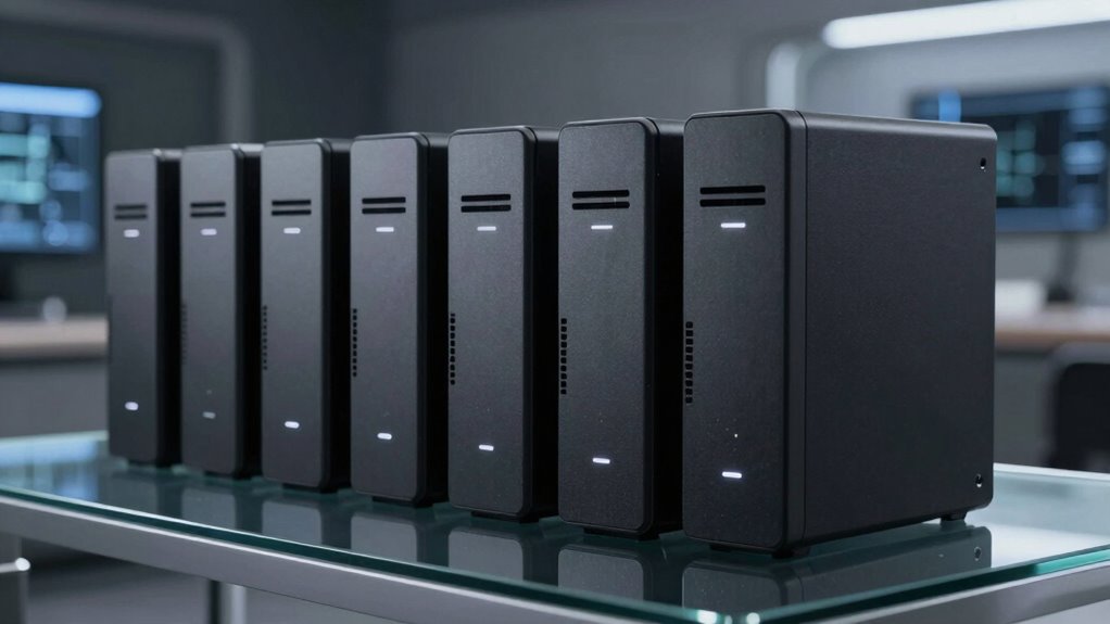 Choosing the right NAS depends heavily on its performance specs, which determine how smoothly it handles your data and multitasking needs. The CPU’s speed and core count are vital, as they influence how well your NAS manages multiple applications simultaneously. Adequate RAM capacity is necessary for efficient caching and supporting several users without slowdowns. Network interface options, like 1GbE, 2.5GbE, or 10GbE ports, directly affect data transfer speeds, impacting overall performance. Hardware acceleration features, such as dedicated GPUs or SSD caching, can dramatically boost processing and access times. Additionally, the maximum supported throughput—measured in MB/s or GB/s—indicates how quickly large files can be transferred across your network. Prioritizing these specs guarantees your NAS performs reliably under your workload.