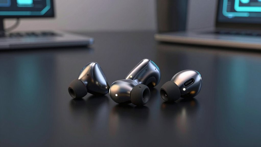 A proper fit and comfort substantially impact your overall experience with noise-canceling earbuds. An airtight seal is vital for effective noise cancellation, preventing external sounds from sneaking in. Comfort depends on the size and shape of the ear tips, which should come in multiple sizes to suit different ear contours. A secure fit not only enhances noise cancellation but also reduces ear fatigue during long listening sessions and keeps the earbuds in place during physical activities. Lightweight designs and ergonomic shapes contribute greatly to comfort, especially if you wear them for hours or move around actively. Adjustable ear hooks or wings are helpful features that guarantee a snug fit, boosting both noise cancellation and overall satisfaction. Prioritizing fit and comfort helps you enjoy your music without distraction or discomfort.