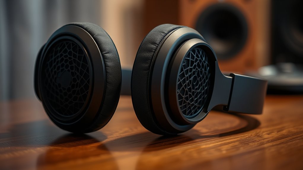 Achieving outstanding sound quality clarity in open-back headphones hinges on selecting models with high-quality drivers that deliver accurate frequency responses. These drivers ensure crisp highs, detailed mids, and tight bass, essential for a truly transparent listening experience. Low distortion levels, ideally below 0.05%, are vital to keep audio clean and precise, preventing muddiness or echo effects that can obscure subtle details. Proper damping and acoustic design help reduce internal resonance, allowing the headphones to reproduce even the smallest nuances with clarity. Additionally, an extended frequency response—up to 39,500 Hz—means you can perceive more of the high-frequency spectrum, adding depth and realism. When these factors come together, you’re rewarded with sound that’s not only accurate but also immersive and natural.
